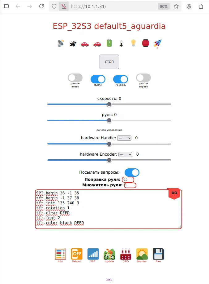 В качестве скриншота (и демки, базовой коробки скриптов на чипе) я оставил панель управления автомобилем, который начал когда-то собирать из игрового руля и колес гироскутера. Проект не закончил, и детали утрачены вместе с сараем, в котором я это собирал, но моделька осталась красивая и хорошо иллюстрирует возможности фреймворка.